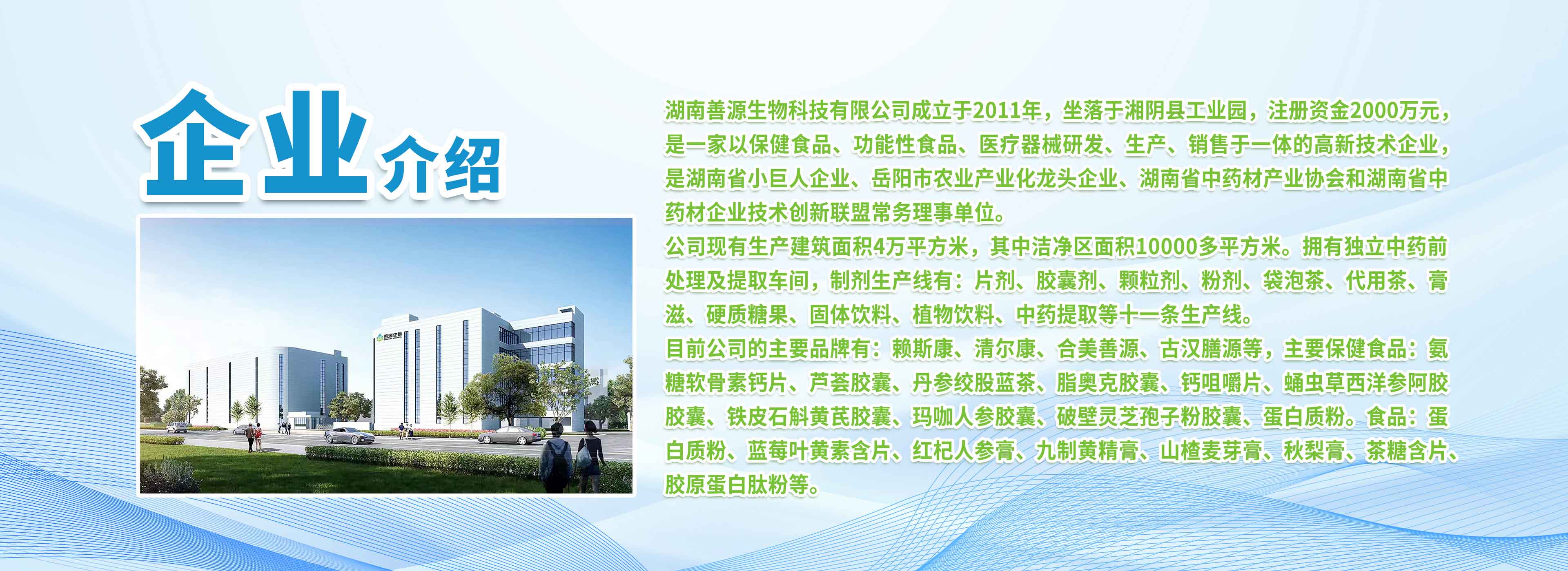湖南善源生物科技有限公司坐落于湖南省岳阳市湘阴县工业园,占地面积4万多平方米,现有片剂、胶囊剂、颗粒剂、口服液、粉剂、润喉糖、压片糖果、固体饮料、中药提取等生产线,是湖南省规模较大的保健食品GMP认证企业。