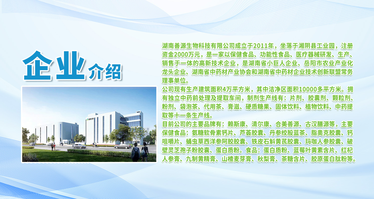 湖南善源生物科技有限公司成立于2011年,是一家以保健食品、功能性特色食品研发为主,集研发、生产、销售、服务于一体的大型多元化高科技企业。